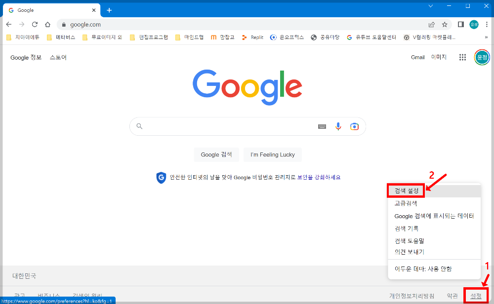 구글 페이지로 이동하게 되면 우측 하단에 보이는 [설정] → [검색 설정]을 차례대로 클릭합니다.