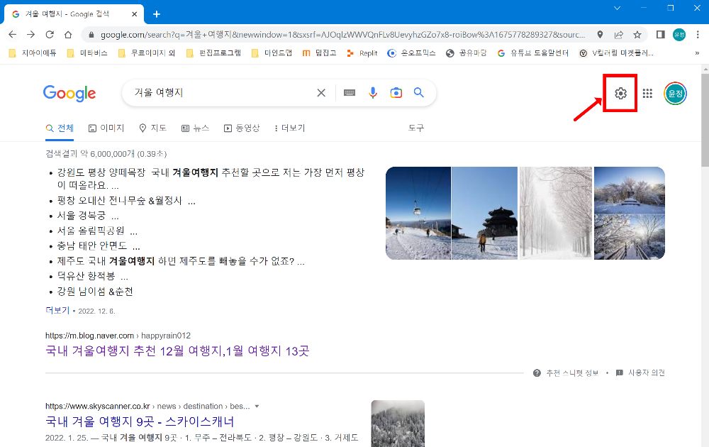 아까 우리가 '겨울 여행지'라고 검색하던 아래의 화면을 보시면 검색상자의 우측 편에 톱니바퀴 모양의 [설정] 버튼이 뙇!! 하고 있는 거 보이시죠???